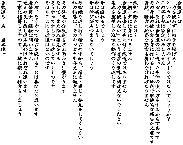 �@�@�@��{�I�ɁA�ȉ��̂悤�ȁu���v��݂��āA�m�É����߂Ă����܂��B �@�@�@�����F1���`3���@�@�����F4���`6���@�@��O���F7���`9���@�@��l���F10���`12�� �@�@�@10��/����̌m�Â���{�Ƃ��܂��B �@�@�@���s���ɂ��A11��̌m�×\����o�����Ƃ�����܂����A����̓T�[�r�X�Ƃ��l�����������B �@�@�@�ȏ�̒��ŁA10��/��������������Ɍ���A���̊��U��ւ��Ƃ����đՂ��܂��B �@�@�@�\��\��11��m�×\��ƂȂ��Ă�����ł��A10��������Ȃ���ΐU��ւ��͒v���܂���B �@�@�@���̊��U�ւ������Ȃ���́A�U�ւ̂����Ȃ���������ԋ��v���܂��B �@�@�@��1�̌v�Z���@��������i3�����j�̌�����v��10�� �@�@�@�ڂ����́A�\��\���Q�Ƃ��������B�i��ق̌��I�s����}�Ȏg�p���ɂ��A�ύX���邱�Ƃ�����܂��j �@�@�@�\��\�y�[�W ![]() �@�@�@�����N�E������ �@�@�@�@�@��V��@���b�̗͂�g�ɂ��鎖����Ƃ��܂��I�B �@�@�@�@�@�m�Â�ʂ��ɂ݂�m��A������v�����C�����⋭�����_��g�ɕt���鎖��ړI�Ƃ��܂��B �@�@�@�@�@�y�c�t���z �@�@�@�@�@�@�Z�̏K�������A�Z�̏K���ɑ��Ċ���Ă��炤�i�K�ł��B �@�@�@�@�@�@����̎q�Ɣ�ׂāu���f�������Ă���̂ł́H�v���ƐS�z���Ȃ��ł��������I �@�@�@�@�@�@�S�������܂���I�܂��́A�u�Z�ɐG���v������ł��B �@�@�@�@�@�y���w���z �@�@�@�@�@�@��w�N�ɂ����ẮA�����ɂ��Č��������ӂ��Ă����܂����A�c�t���ƖړI�͕ς��܂���B �@�@�@�@�@�@�����A�i���R���̎��ł���悤�ɂȂ�܂��B �@�@�@�@�@�@��������݂ɂȂ�A���m�Âɗ�ޗl�ɂȂ鎖�����z�ł��B �@�@�@�@�@�@���w�N�́A���C���Z�i���Ɍ^�����S�j�̏K����ڎw���Ă��炢�܂��B �@�@�@�@�@�@������x���ɂ���ẮA�g����s���Ă��炢�܂��B �@�@�@�@�@�y���w���z �@�@�@�@�@�@��ʕ��Ɉڂ��Ă����F�̂Ȃ��A�l�i�E�̗́A�����č��C���Z�̏K����ڕW�Ƃ��܂��B �@�@�@�@�@��������̑g��́A�O���ȏオ��{�B�A���A���w�ܔN���ȏ�́A�܋��ȏオ�ΏۂƂȂ�܂��B �@�@�@�@�@���N�E�������@�m�É摜 �@�@�@����ʕ� �@�@�@�@�@��{����E�^�m�Â𒆐S�Ɍm�Â�v���܂��B �@�@�@�@�@���A�Ō��Z�E�ł����݁E�~�b�g�ł��E�g�蓙���s���A�L���Ȍ�g�����Ƃ��Ă̍��C����g�ɕt���܂��B �@�@�@�@�@�g��́A�N��E�̗͂��l�����āA�����Ȃ��g�肪�ł���悤�ɔz�����܂��B �@�@�@�@�@���g��́A�F�ю擾�҈ȏ�i�����擾�҈ȏ�j �@�@�@�@�@��{�I�ɂ͌^�m�Â����S�ł��B �@�@�@�@�@�܂��A���S�����l�����m�Â�S�|���܂��̂ŁA������s�N�̕��X�ł��C�y�ɎQ���ł�����e�ł��B �@�@�@�@�@�������E�i���Z�̖��o���҂ł��劽�}�ł��B���J�Ɏw���v���܂��I �@�@�@�@�@��ʕ��@�m�É摜 |